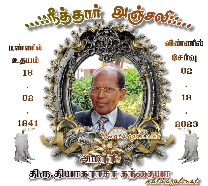 யாழ். அரியாலையைப் பிறப்பிடமாகவும்,  அவுஸ்திரேலியா (Dandenong. Melbourne) ஐ வசிப்பிடமாகவும் கொண்ட தியாகராசா கந்தையா அவர்கள் 02-12-2023 சனிக்கிழமை அன்று இறைபதம் அடைந்தார்.