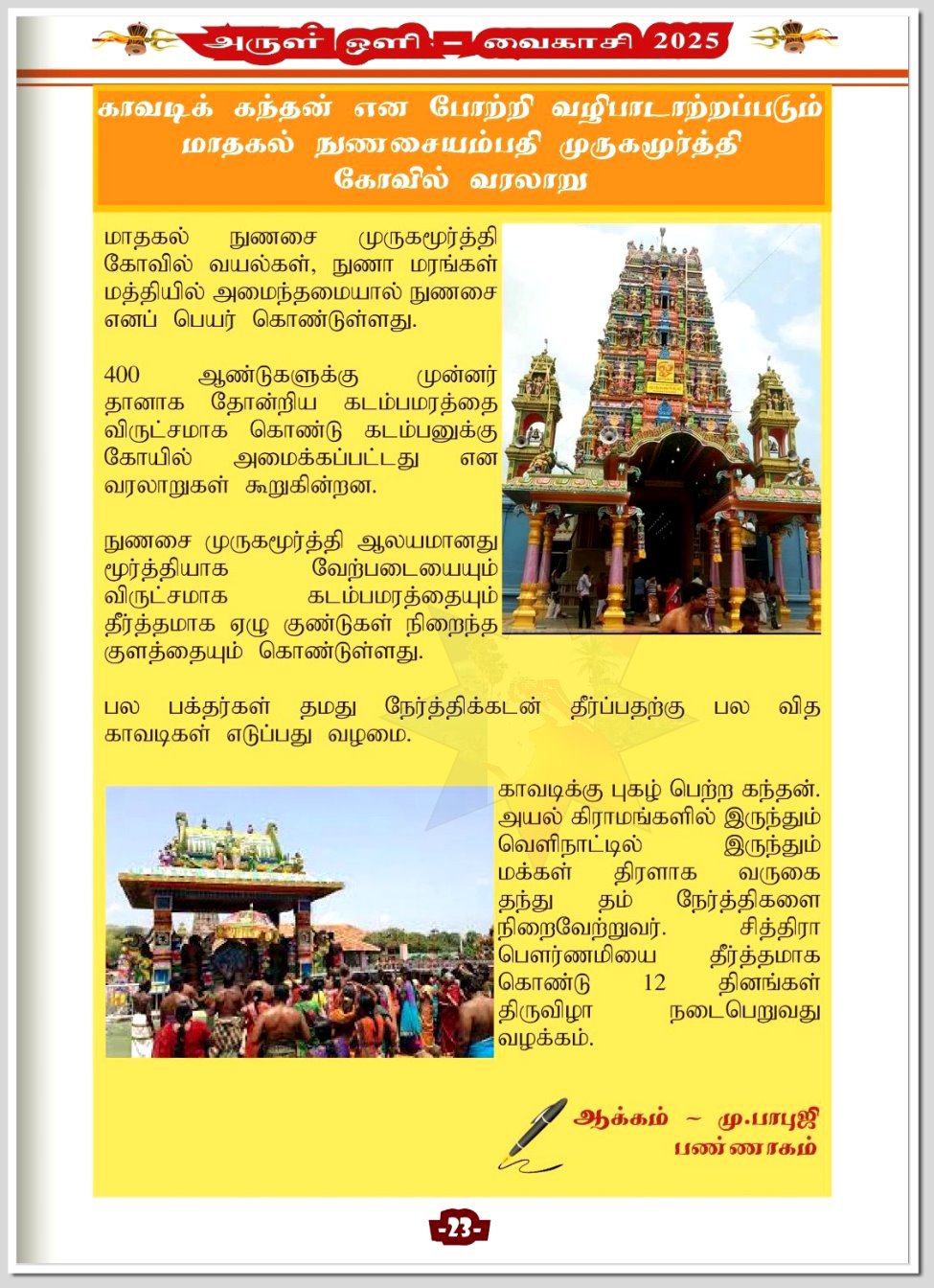 காவடிக்கந்தன் என போற்றி வழிபாடாற்றப்படும் "மாதகல் நுணசையம்பதி முருகமூர்த்தி" தேவஸ்தானத்தை பற்றி தெல்லிப்பழை துர்க்காதேவி தேவஸ்தானத்தால் மாதந்தோறும் வெளியிடப்படும் ஆன்மீக மாத சஞ்சிகை "அருள் ஒளி" வைகாசி மாத இதழில் வெளியான ஆக்கம்.